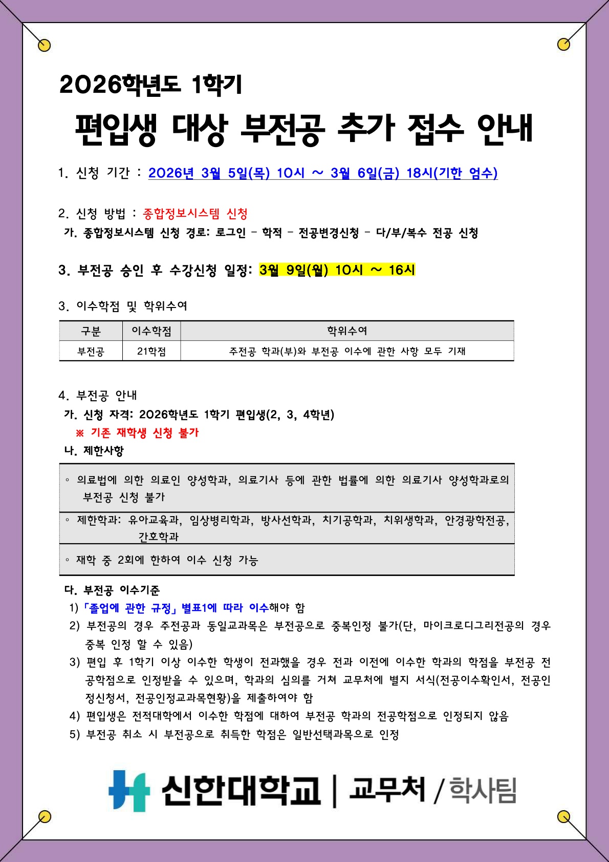 [학사팀/학적] 2026학년도 1학기 편입생 대상 부전공 추가 접수 안내